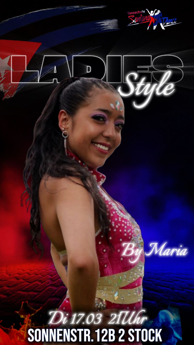 LADIES STYLE WORKSHOP by Maria Posted by Santana in Workshop | Preis: 15€ Date: Di., März 17, 2026 Zeit: 21:00 - 22:30 Location: Sonnenstraße 12b/2. Stock