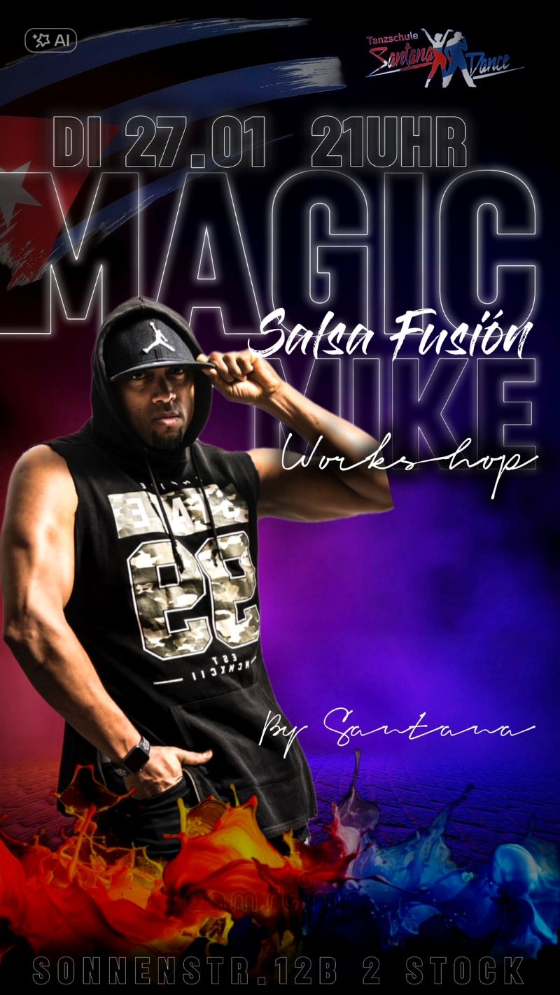SALSA MAGIC MIKE WORKSHOP Posted by Santana in Salsa, Workshop | Preis: 20€ Date: Di., Jan. 27, 2026 Zeit: 21:00 - 22:30 Location: Sonnenstraße 12b/2. Stock